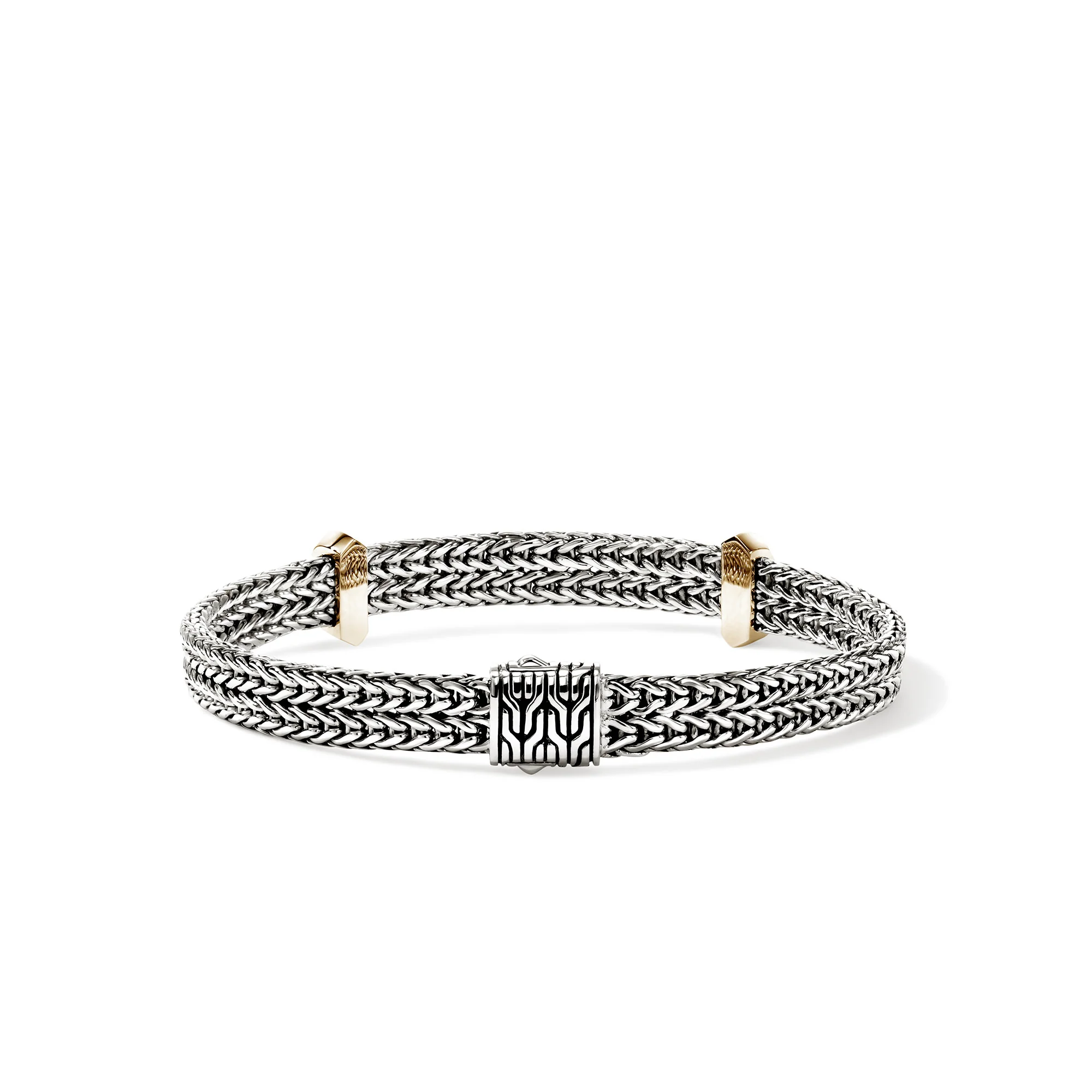 This low-profile bracelet features a technically masterful weave reminiscent of knit textile. Artisan handcrafted in reclaimed sterling silver with gold accents.