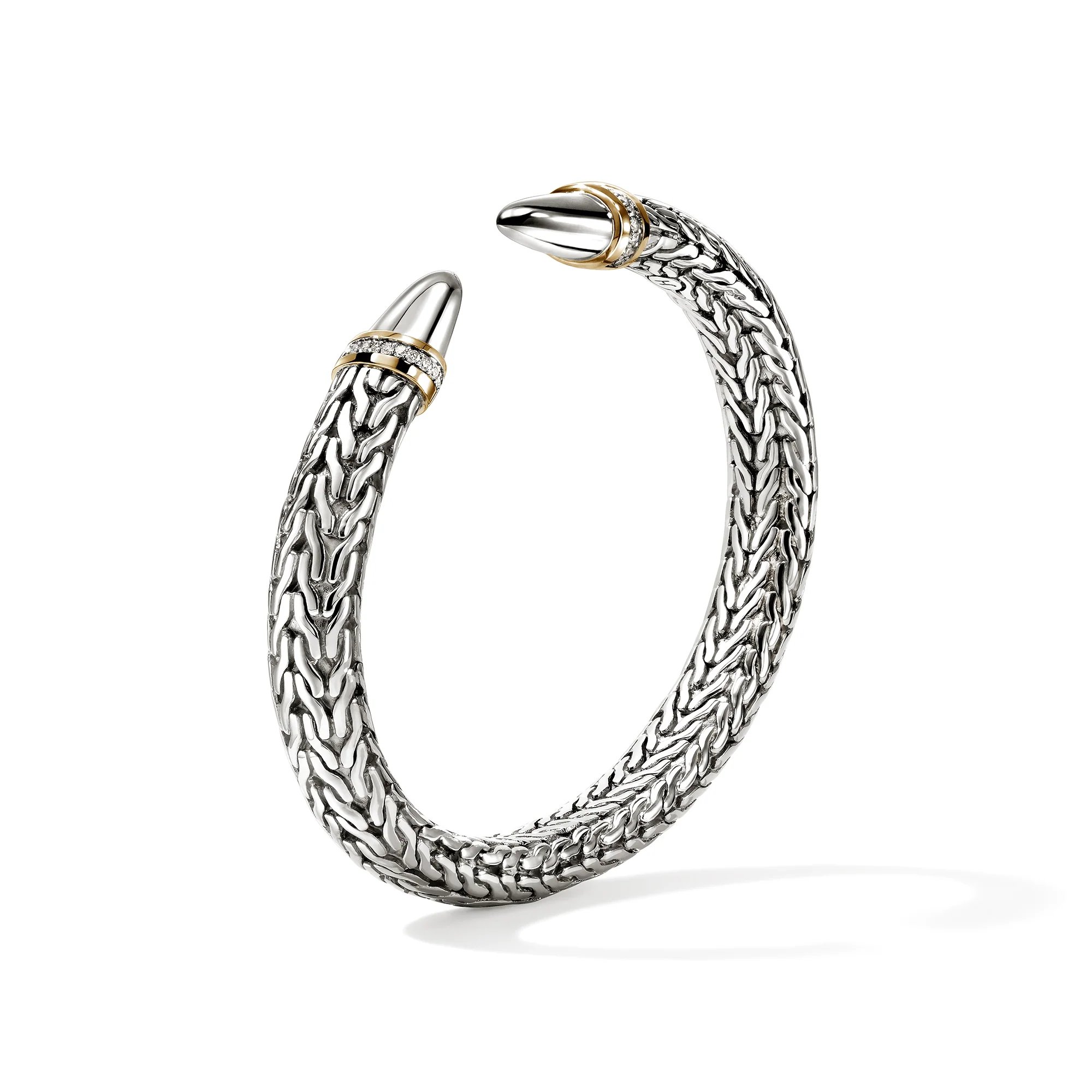 This archive-inspired flex cuff features our iconic carved chain motif, culminating in sleek, polished tips. Artisan handcrafted in reclaimed sterling silver and gold with ethically sourced diamond pavé accents.
